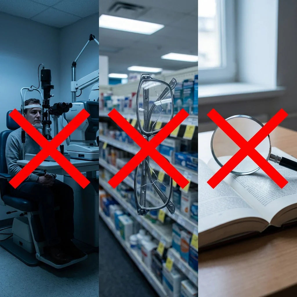 Les lunettes d'optique traditionnelle coûtent entre 300 et 800 €, vous avez besoin d'un rendez-vous, de mesures, d'attendre 7 à 10 jours, d'y retourner pour les ajustements... et le pire : dans un an et demi, votre vue change et elles deviennent inutilisables. De l'argent jeté dans le tiroir des vieilles lunettes.