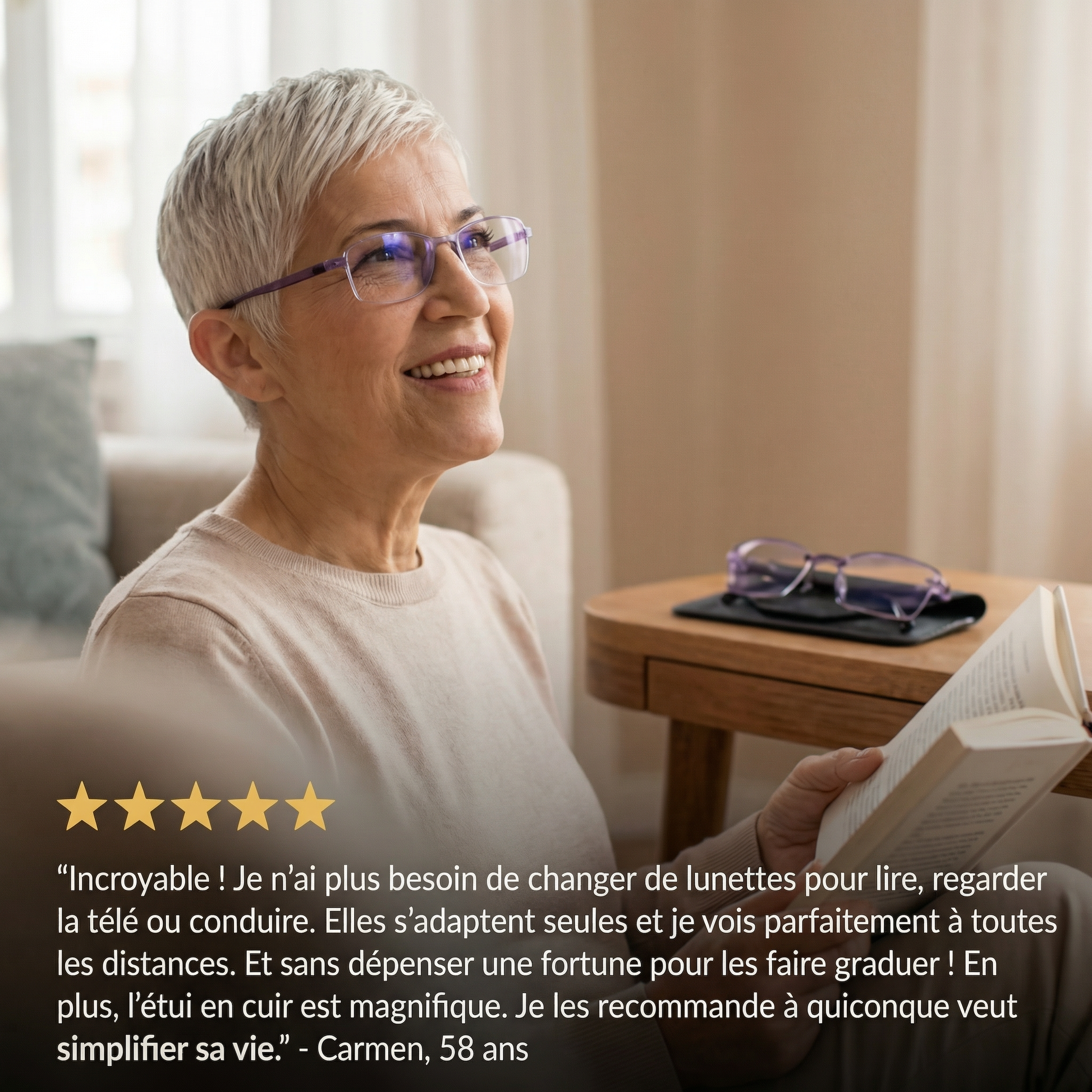 📍 Carla L., France, 58 ans : « Mon sac était plein de lunettes : une paire pour mon téléphone, une autre pour regarder la télé, une autre pour lire… C’était un vrai casse-tête ! Maintenant, je peux tout faire avec celles-ci. Mon mari en rit, car je ne passe plus mes journées à chercher “l’autre paire de lunettes”. Et en plus, elles ne m’ont coûté que le prix d’un dîner. »